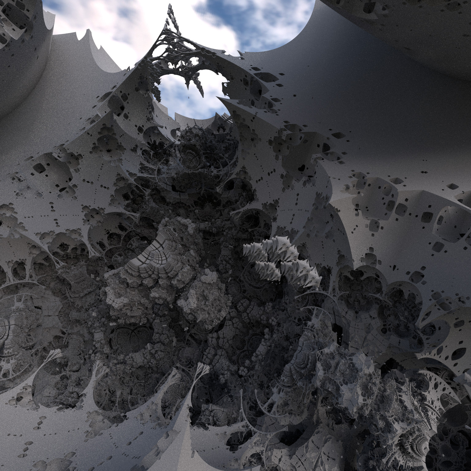 Cackle uses sphere tracing to render 3D fractals like the Mandelbox, Mandelbulb and Pseudo-Kleinian Menger. Each fractal is represented using a distance estimator (DE) function. Given a point in 3D space, the DE returns the closest distance from the fractal's surface to that point. Material color is accomplished through the use of orbit traps.